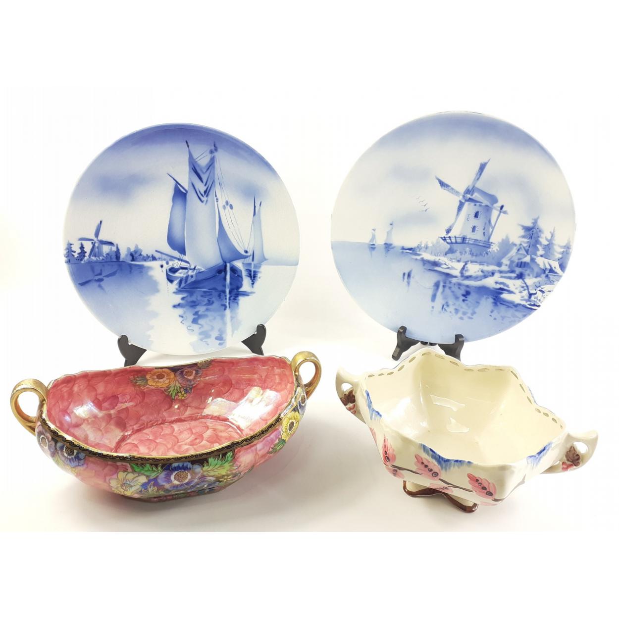 Two delft style Made in Germany collector plates and a Maling bowl and a Unicorn bowl.