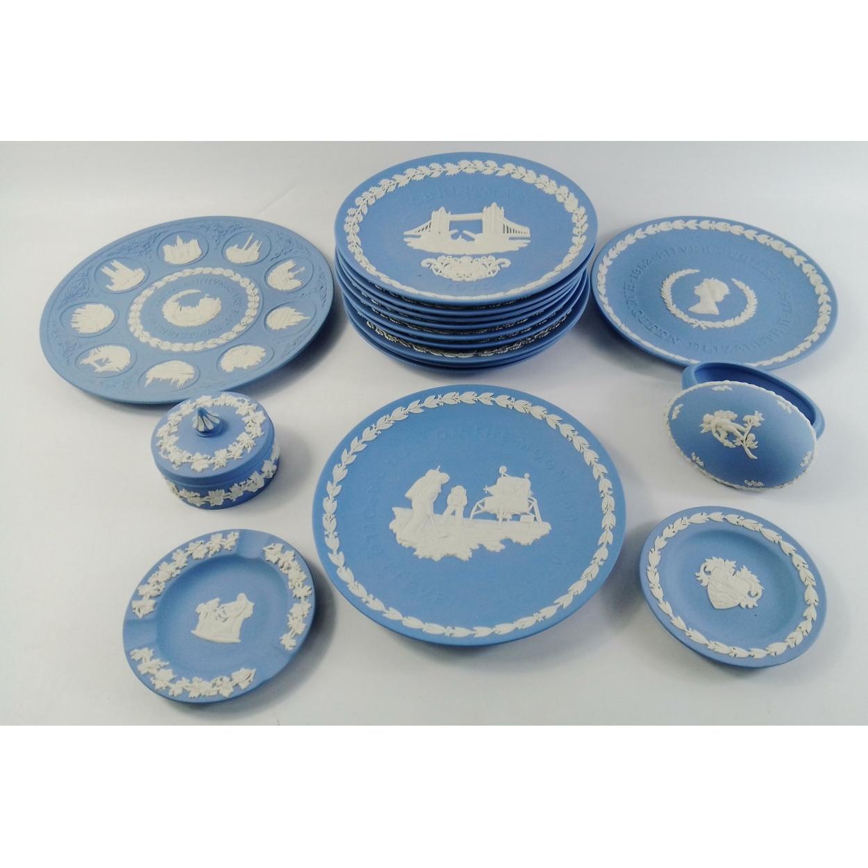 WEDGWOOD. Jasperware collection to include Christmas plates, 1970, 1971, 1972, 1973, 1974, 1975, 1976, 1977, 1978 along with the 10 year collection plate. Also 1977 Jubilee plate, 1969 Man on the Moon as well as egg shaped trinket box, one other lidded trinket box, a pin dish and an ashtray. a super collection of sixteen pieces all in good condition.