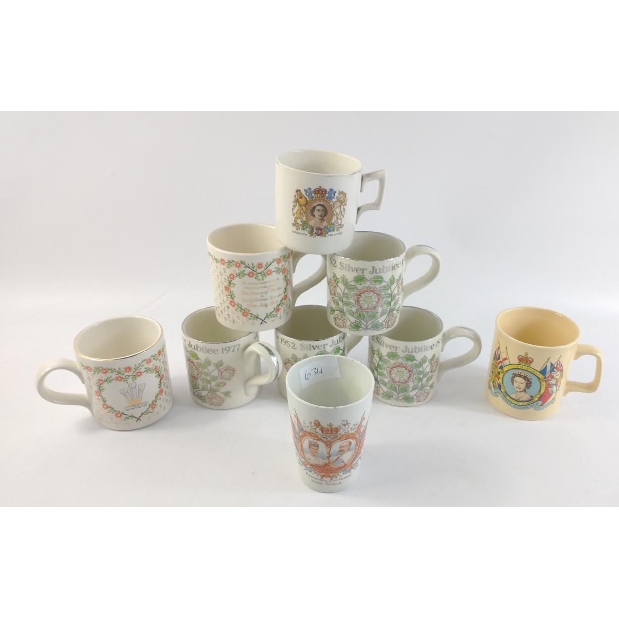 A collection of nine Royal commemorative mugs comprising eight Queen Elizabeth II mugs and a 1902 Coronation Beaker.