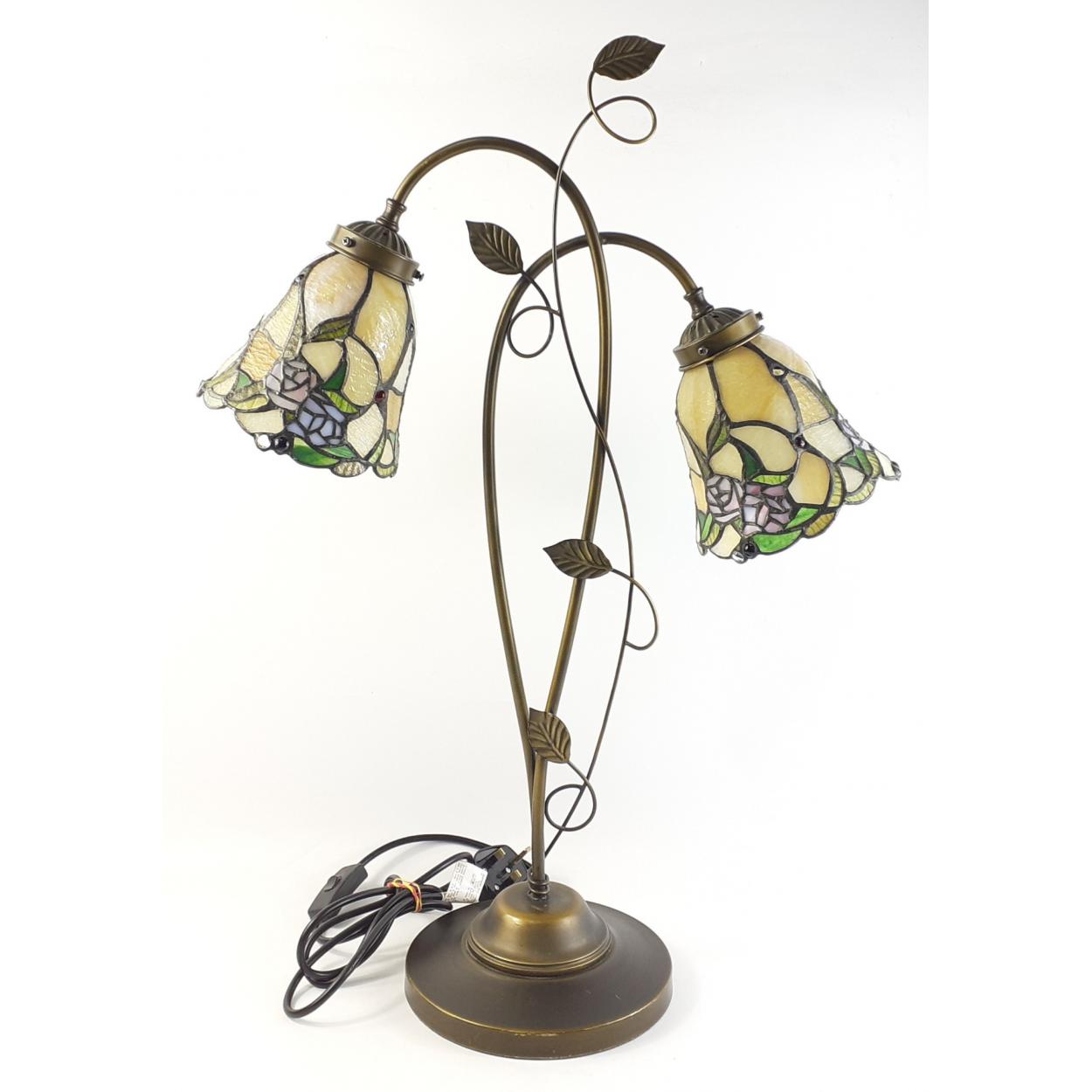 A lovely TIFFANY style two branch table lamp with floral metal stems and two lovely shades with glass beading. 70cm high approx.