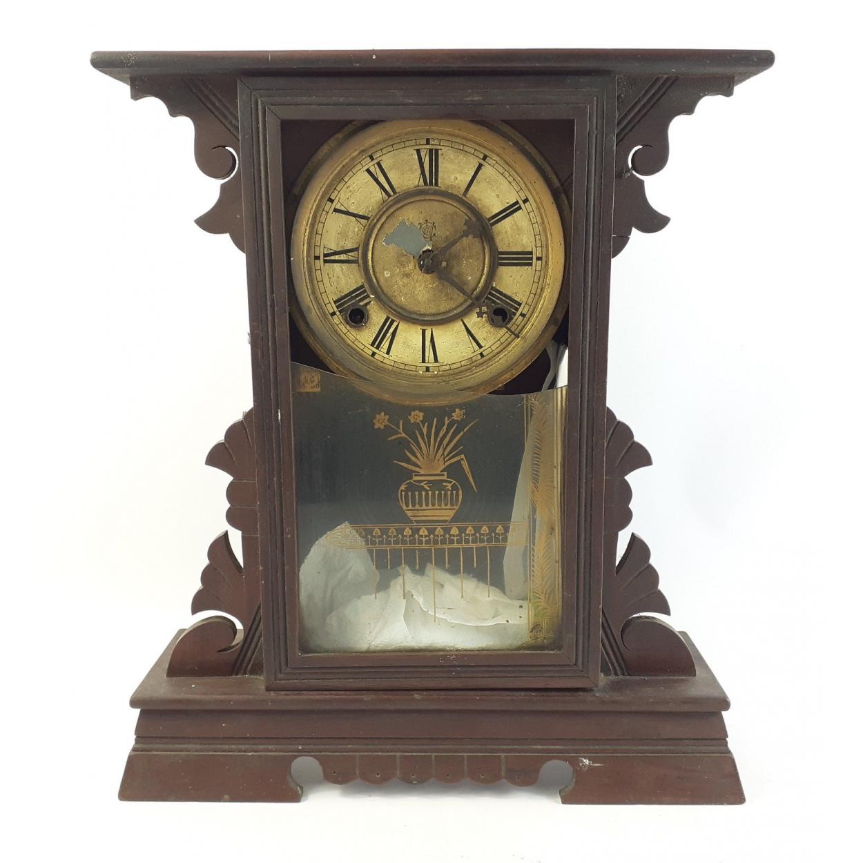 A German wood mantle clock in somewhat distressed condition but clearly a nice piece. 41cm tall approx