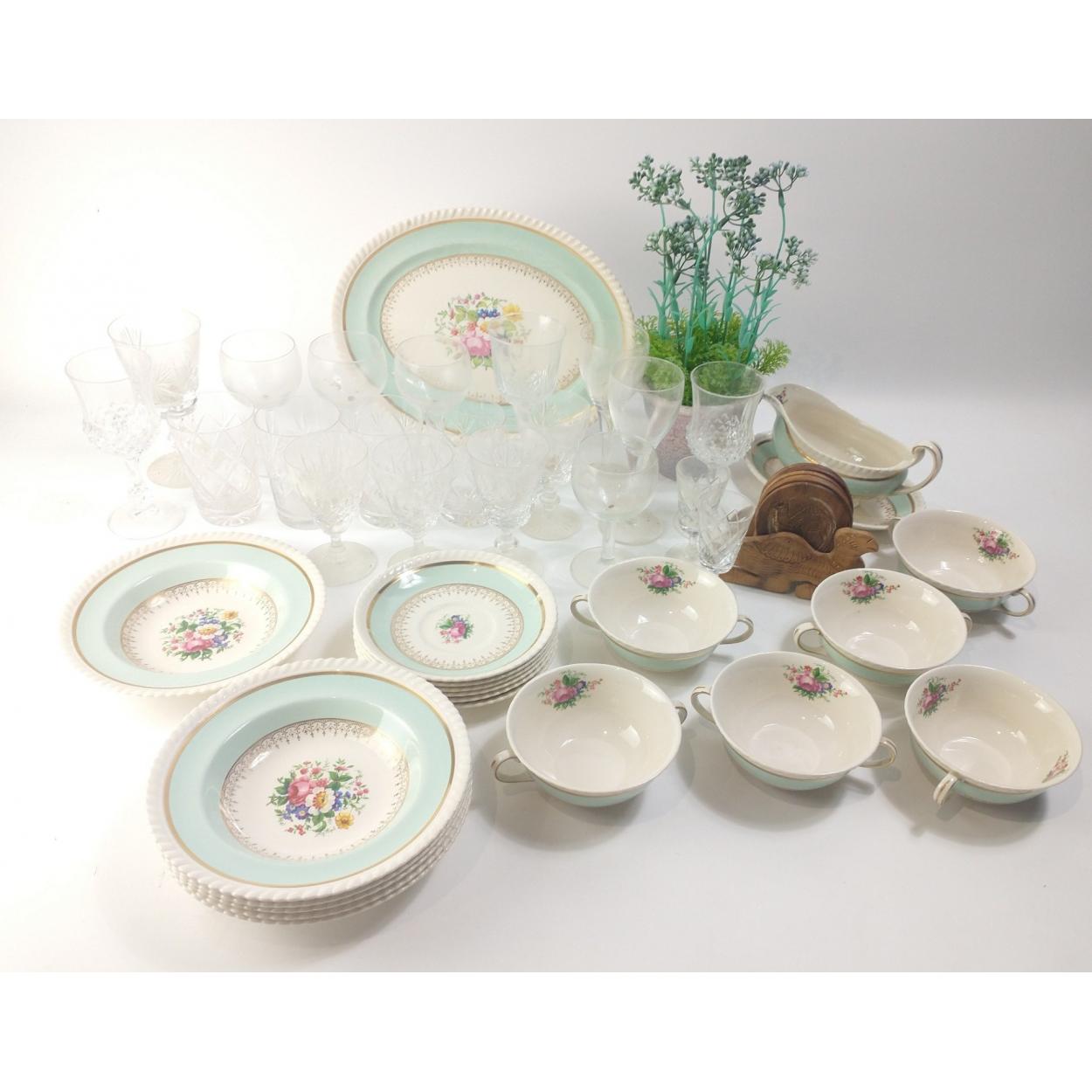 A mixed box to include a part dinner set comprising 6 side plates, 6 twin handled soup bowls and saucers, sauceboat and underplate, sandwich plate, 1 bowl plus various glasses, coasters etc