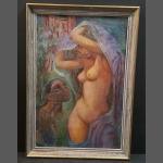 WALTER PRITCHARD (1905-1977) Professor at Glasgow School of Art. A study of SUSANNA AND THE ELDERS, a painting by the Italian Baroque artist Artemisia Gentileschi. Interesting interpretation, Oil on Board. Pritchard primarily know as a Stained Glass artist and worked with the Vendors Father at the GLASGOW SCHOOL OF ART to whom the piece was gifted. The piece is therefore new to the market. Frame 85cm x 60cm, board loose in frame.