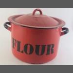 A super large red enamel flour bin. Diameter 25cm approx. In good condition