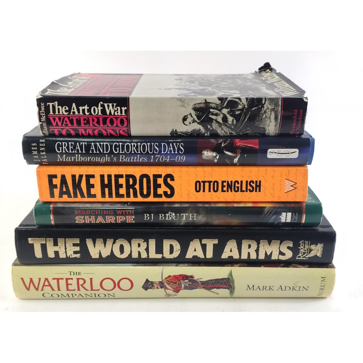 Great gifts for the military historian in your life - FIRST EDITION copies of THE ART OF WAR: Waterloo to Mons by William McElewee, GREAT AND GLORIOUS DAYS: Marlborough's Battles 1704-09 by James Falkner, MARCHING WITH SHARPE by BJ Bluth, THE WORLD AT ARMS: Reader's Digest Illustrated History of WWII, FAKE HEROES by Otto English and a hardcover copy of THE WATERLOO COMPANION by Mark Adkin.