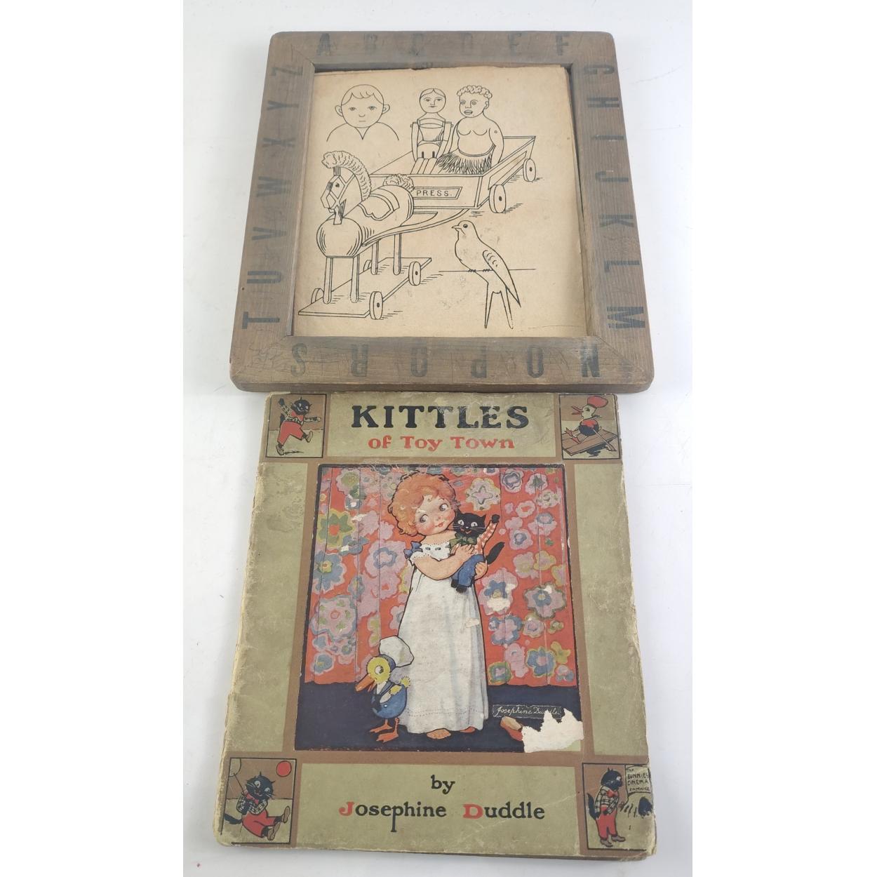 An antique copy of Kittles of Toytown by JOSEPHINE DUDDLE plus a wooden alphabet frame