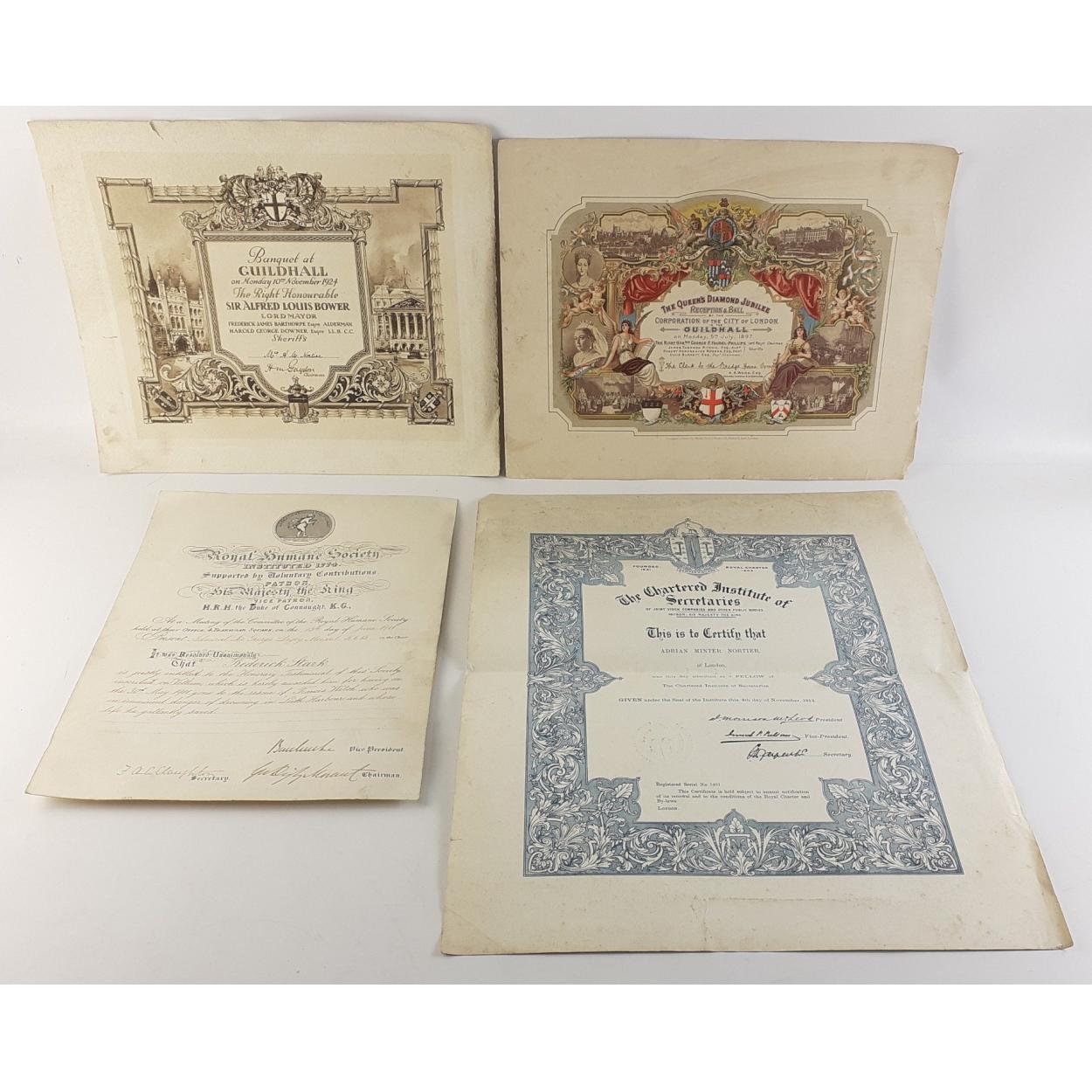 QUEEN VICTORIA 1897 Diamond Jubilee GUILDHALL invite card (note similar sold at auction in America for over $1000). Also a 1924 invite, a 1913 Chartered Institute certificate and a ROYAL HUMANE Society 1911 Life Saving Award for saving a person in Leith Docks signed ''Buccleuch'' A fascinating lot.