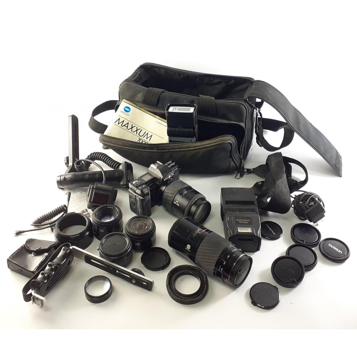MINOLTA 7000 Maxxum camera body with Maxxum 100-300mm lens, Maxxum 70-210mm lens and three others. All a little dirty from long term storage.