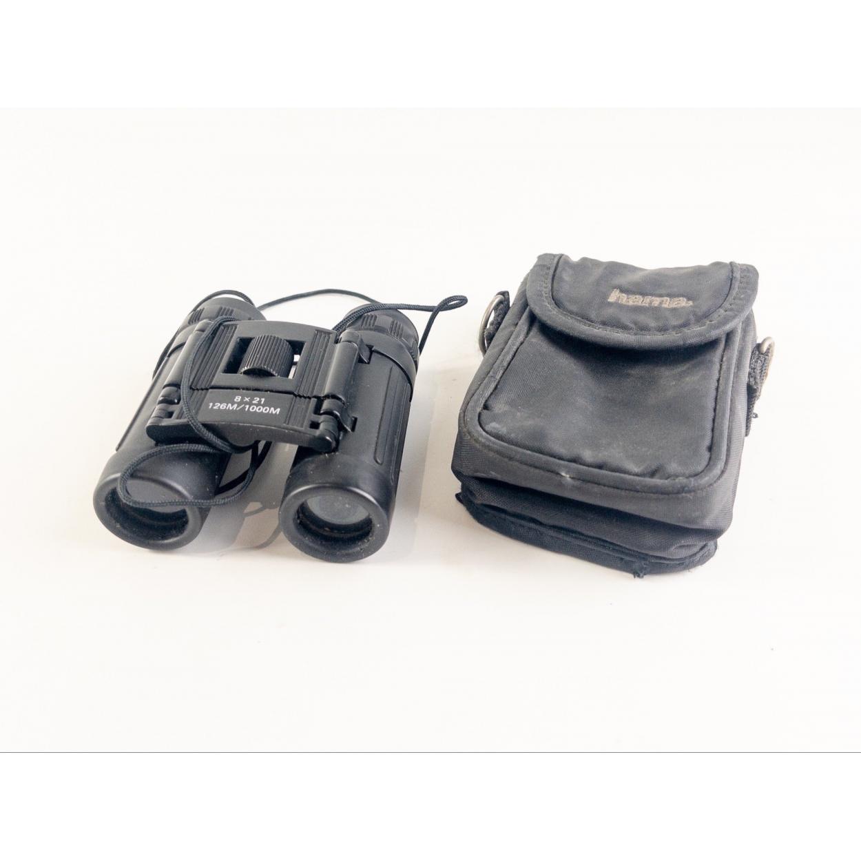 Two Compact OLYMPUS cameras in pouches and a pair of pocket binoculars.