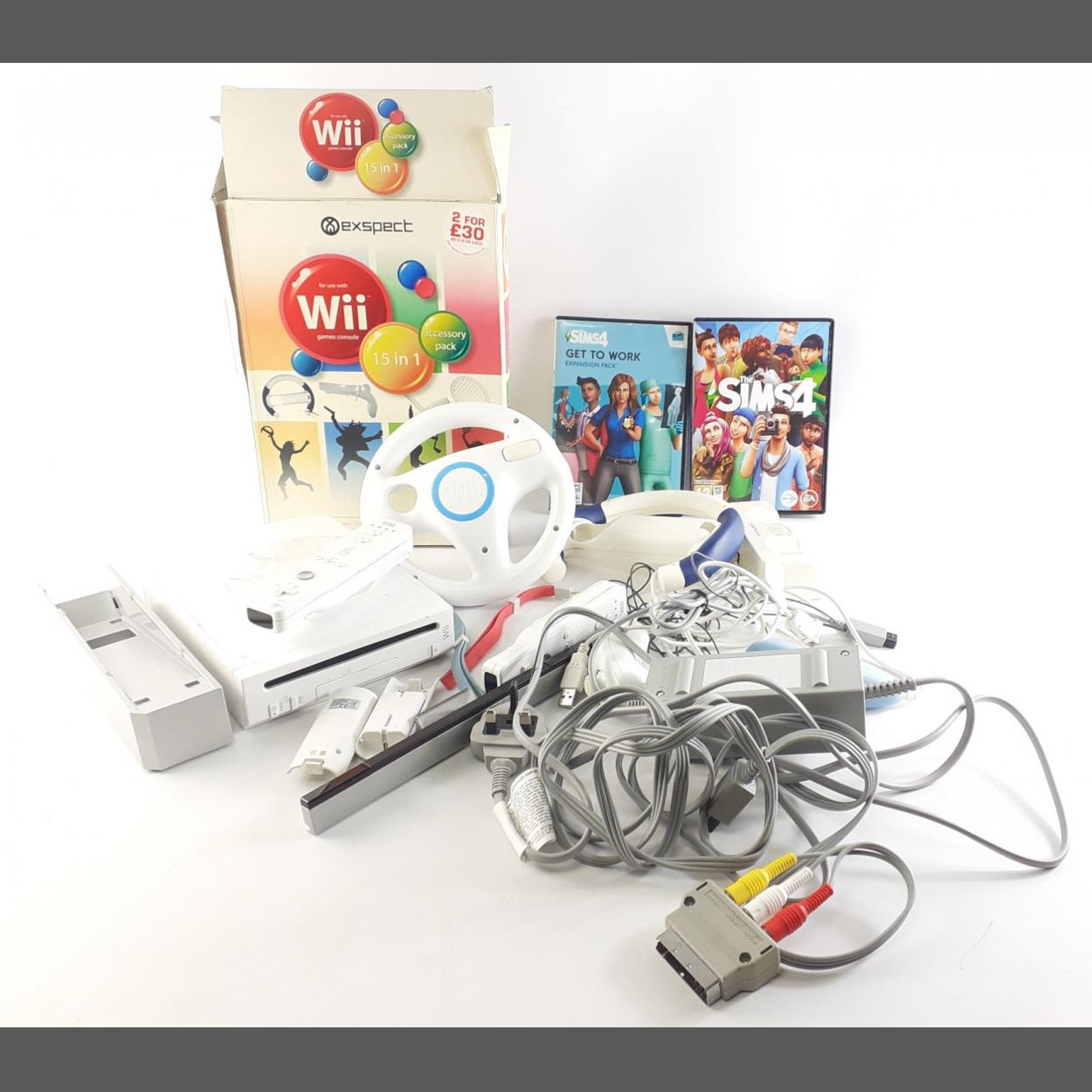 Wii Games console with controllers, cables, wheels etc. and games SIMS 4 with Expansion pack.