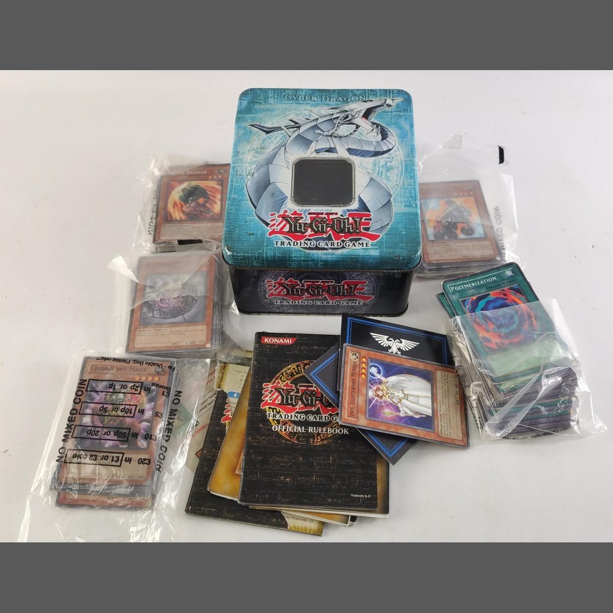 Assorted Konami Yu-Gi-Oh! cards in a tin.
