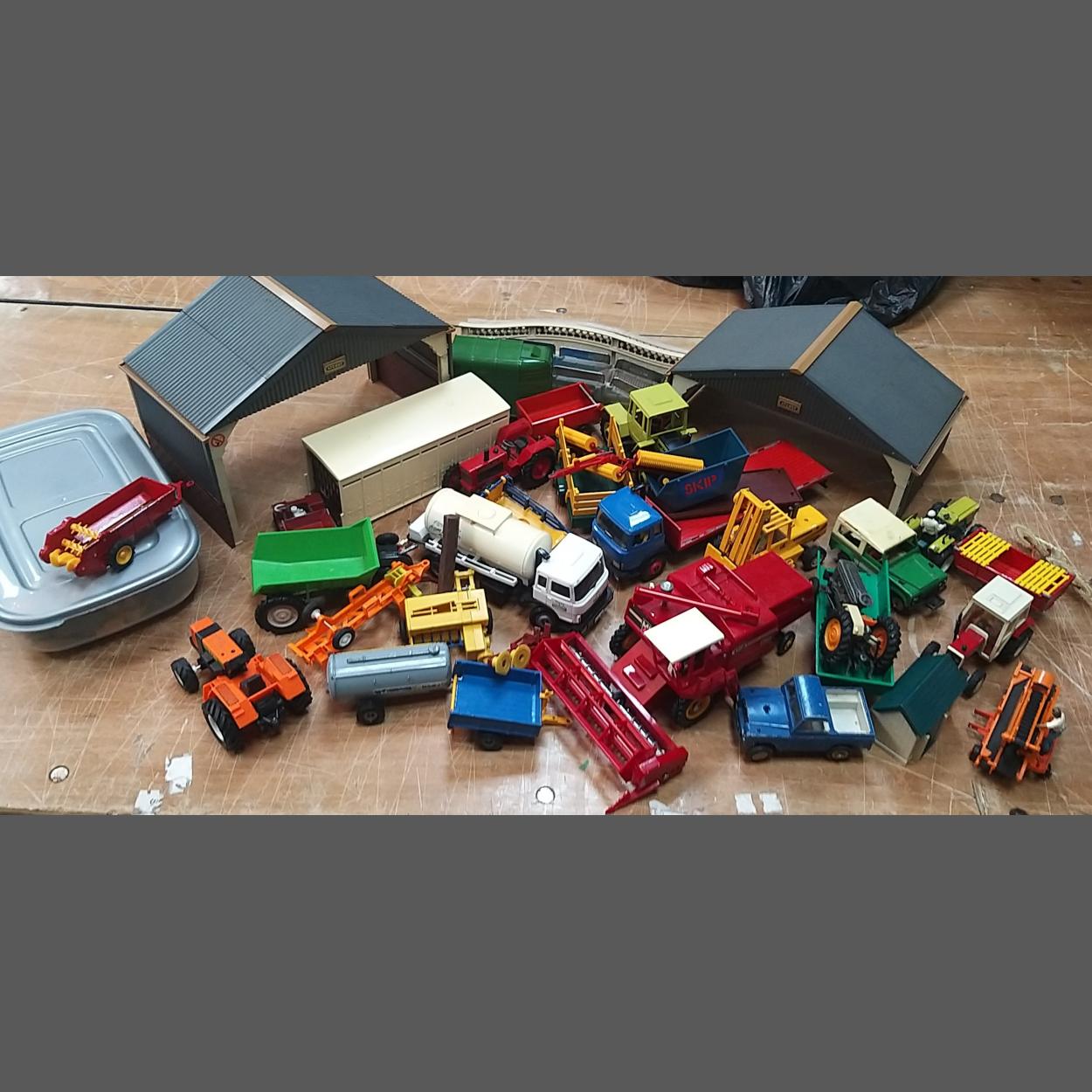 BRITAINS Farm set with farmyard buildings, bales and foliage and many agricultural vehicles. A great vintage lot!