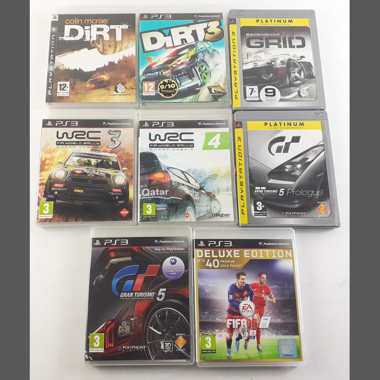 Eight PS3 games to include RACEDRIVER GRID, WRC FIA WORLD RALLY CHAMPIONSHIP, COLIN McRAE, DiRT, GRAN TURISMO 5, GRAN TURISMO 5 PROLOGUE, WRC 4, FIFA 16 Deluxe Edition. DIRT 3 has no disc.