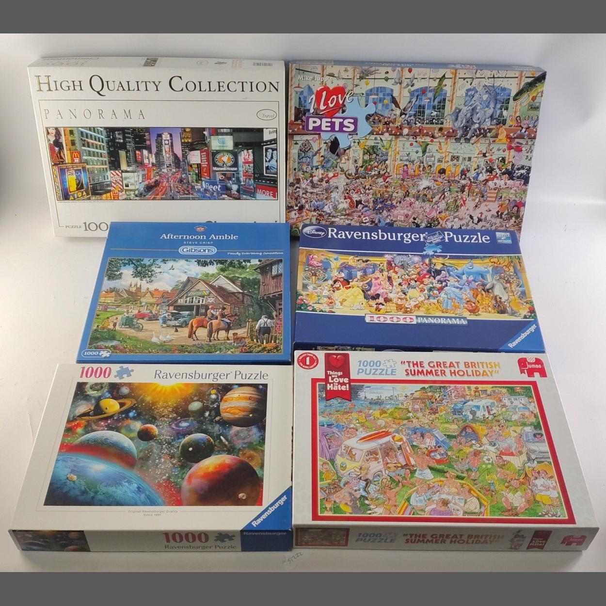 Six 1000 piece jigsaws to include Afternoon Amble, Solar System, Great British Summer Holiday, New York Panorama, I Love Pets etc