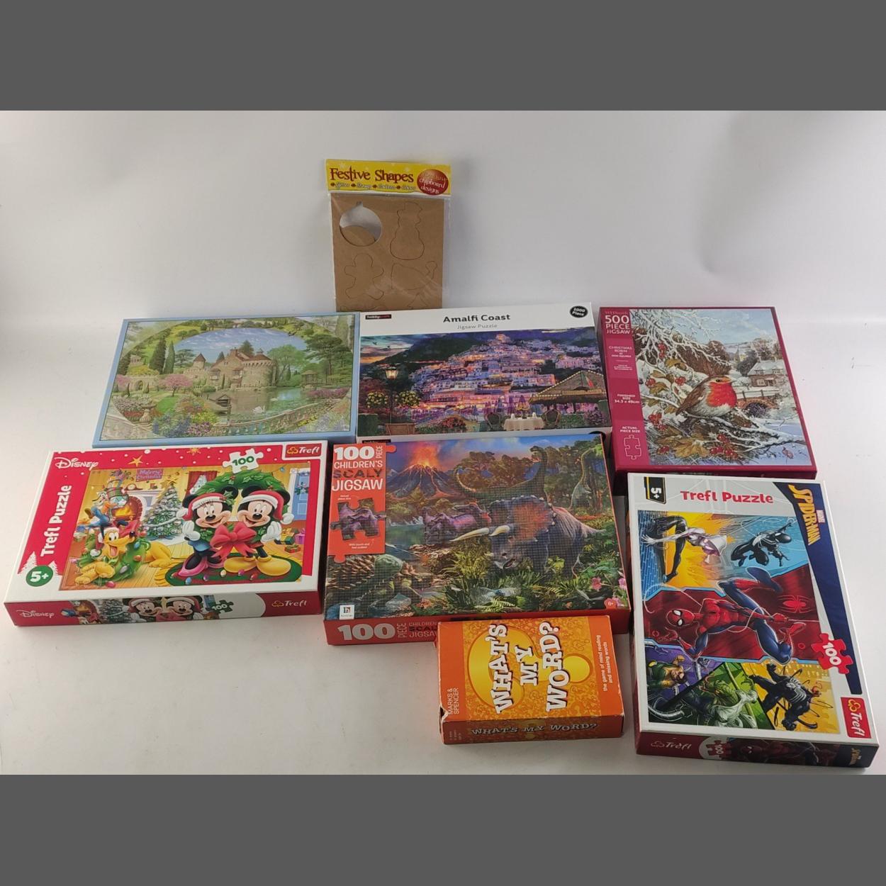 Six jigsaw puzzles to include 2 x 1000, 1 x 500, 3 x 100 including Spiderman, Dinosaurs, Mickey Mouse, Christmas Robin, Amalfi Coast, The Old Castle Garden
