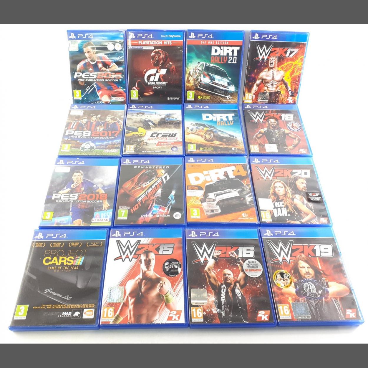 Sixteen SONY PS4 games to include WWE wrestling 2K 15-20, PS4 DIRT 4, Project Cars Of The Year, PS4 Rally, Rally ll, NEED FOR SPEED Remastered, The Crew Willow Run edition, GRAN TURISMO Sport and PES 2015-2018