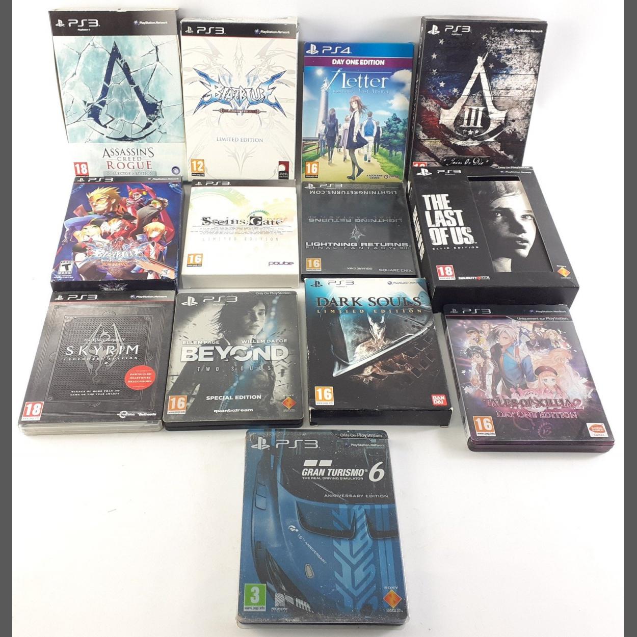 PS3 game collection with some steel books and some collectors editions to include Grand Turismo, Skyrim, Tales of Excelsior, The Last of Us, Beyond Two Souls, Assassin's Creed x2 and more.