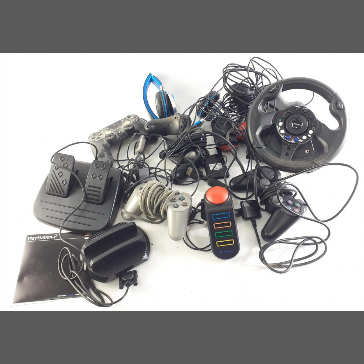 A mixed lot of PLAYSTATION controllers, buzz and headphones.