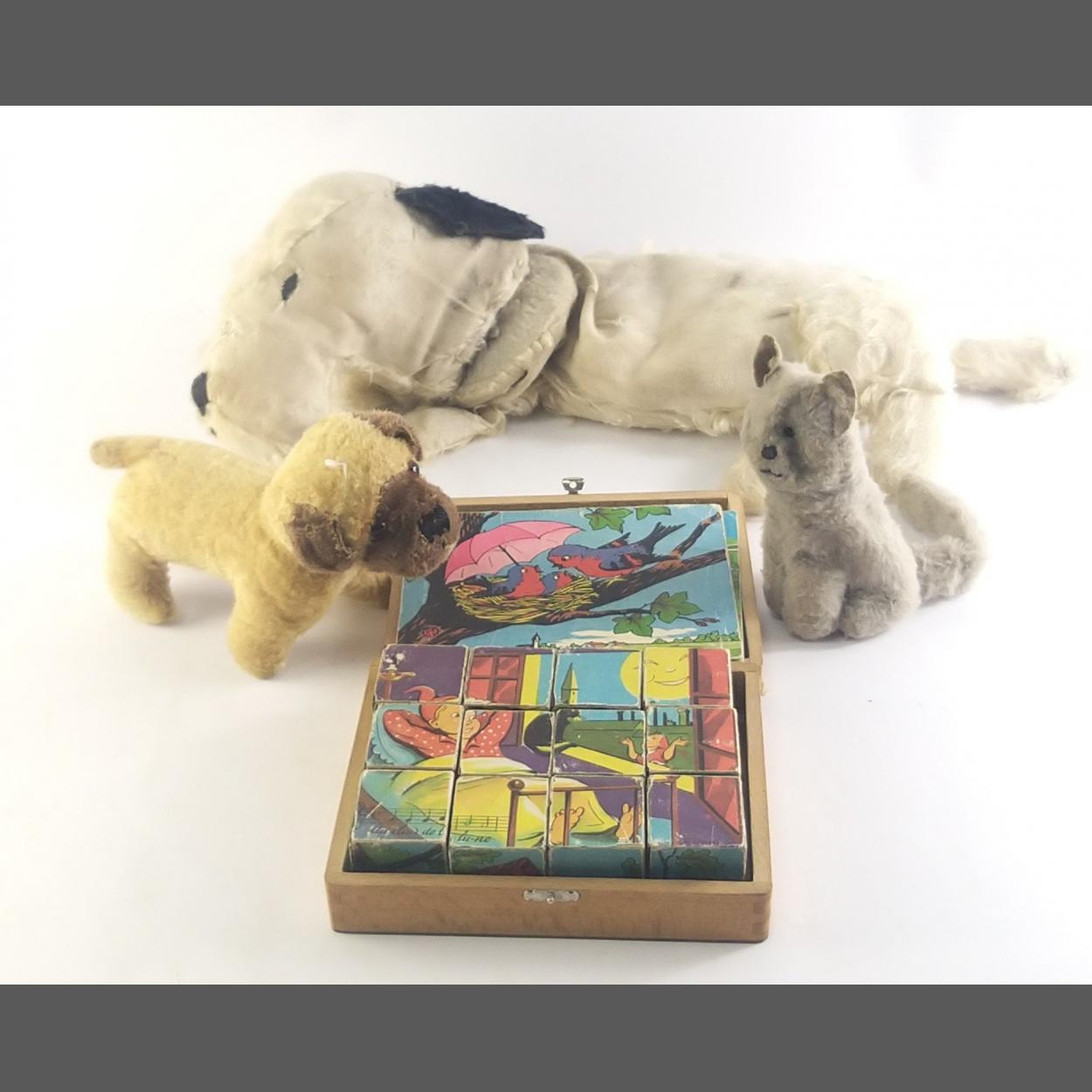 A lovely nostalgic child's lot comprising a rather sad doggy, cute little dog and cat and a vintage twelve block jigsaw