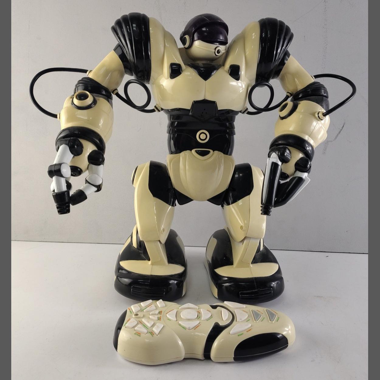 A WowWee black and white ROBOSAPIEN robot with remote control. Stands 25cm approx. Some discolouration to the white parts of the robot and controller. Appears to be in good working order, no instructions.