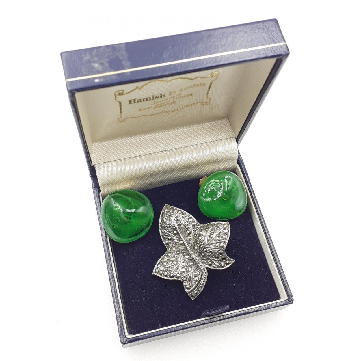 A pretty marcasite leaf form brooch 4cm approx with a pair of clip-on earrings with green stones.