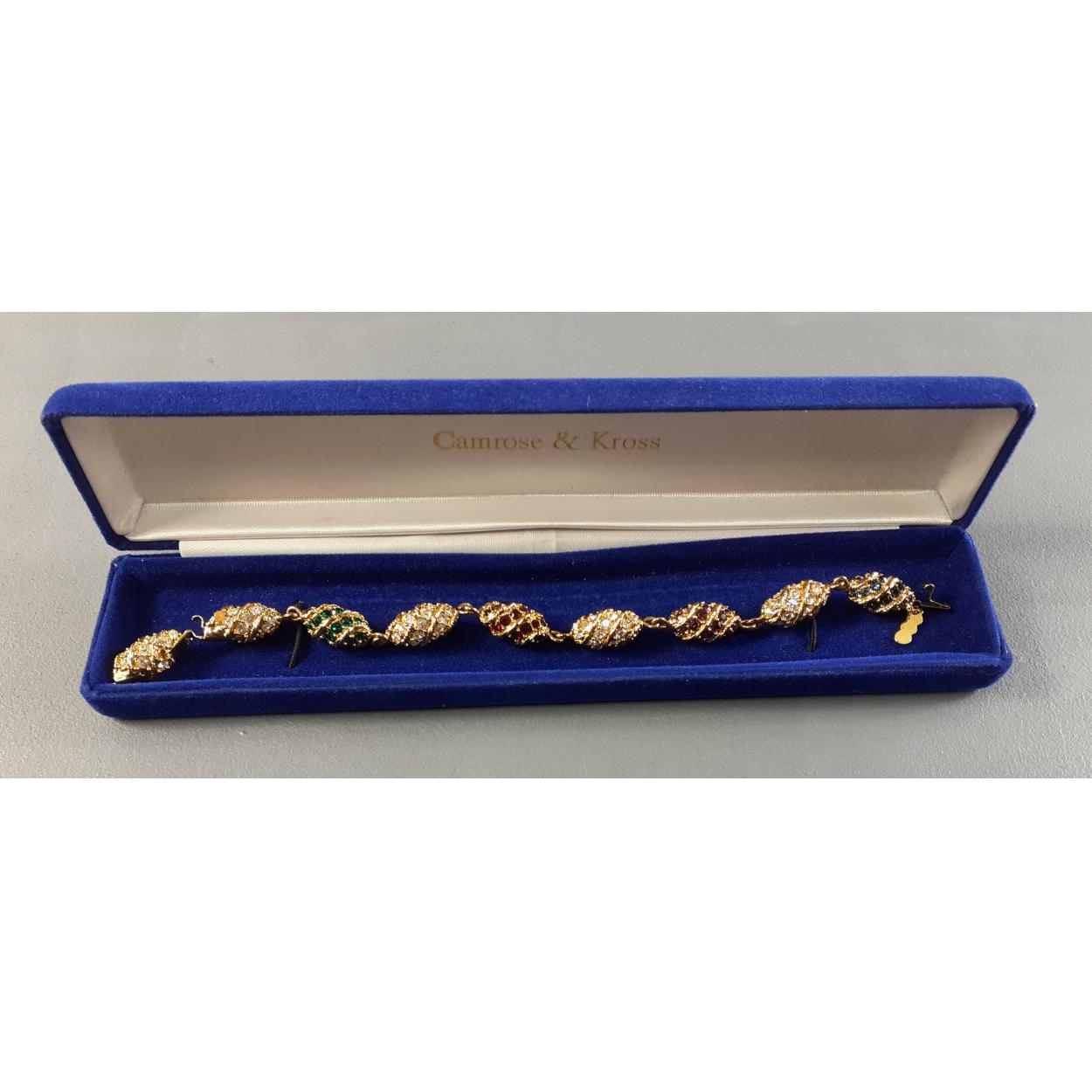CAMROSE & KROSS. Pretty gilt replica Jacqueline Kennedy collection bracelet comprising of white, green, red, purple and blue stone set eggs. Length: 20cm approx