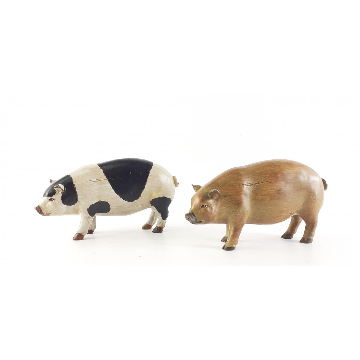 Two lovely decorative wooden models of PIGS. Each 17cm long approx. A few splits noted to the wood but this seems normal and looks good.