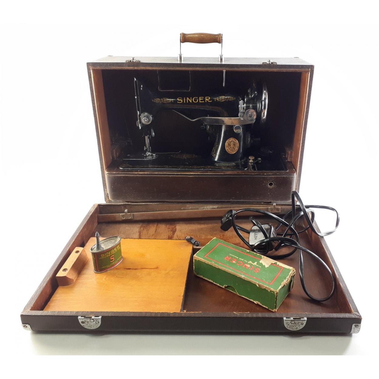 SINGER sewing machine in hard case, possibly a later electric conversion. Appears in good order.