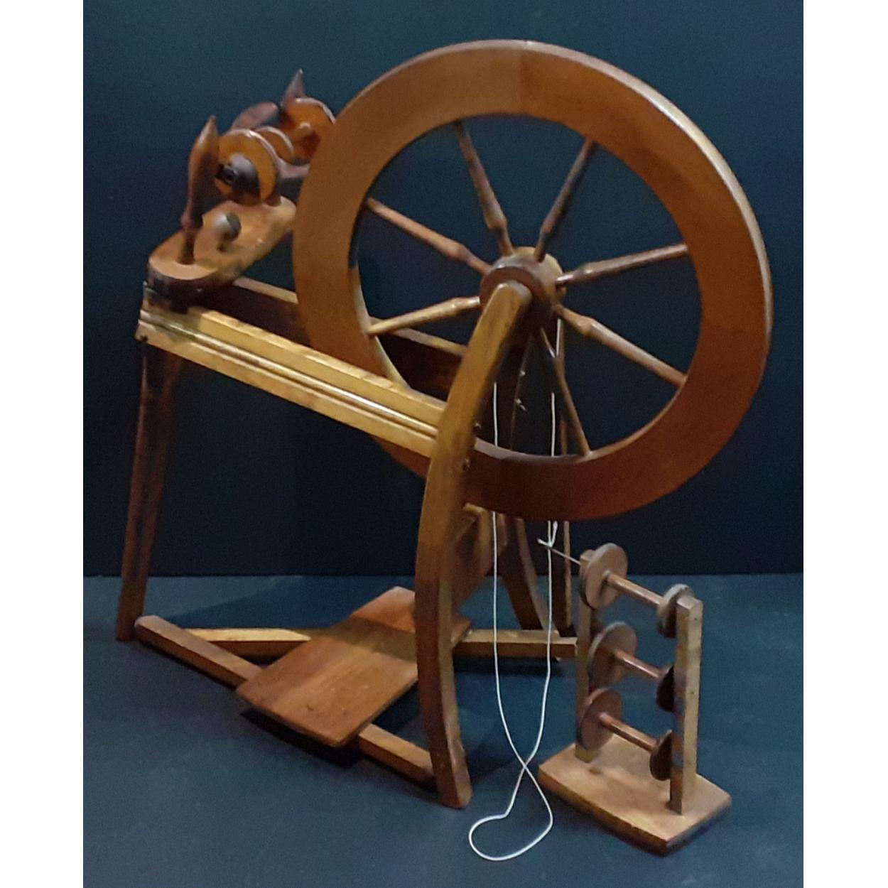 A vintage wooden spinning wheel with bobbins. Stands 86cm high. Appears to be in good useable condition.