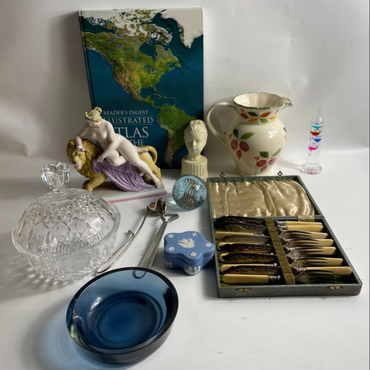 A mixed box to include a MALING WARE LUSTRE bowl (23cm long), a Capodimonte LATTICEWORK basket (16cm) signed by ACER GUBBIO, 2 boxes of 6 horn teaspoons, a neat little tray (28cm long), a retro metal wire magazine rack etc etc