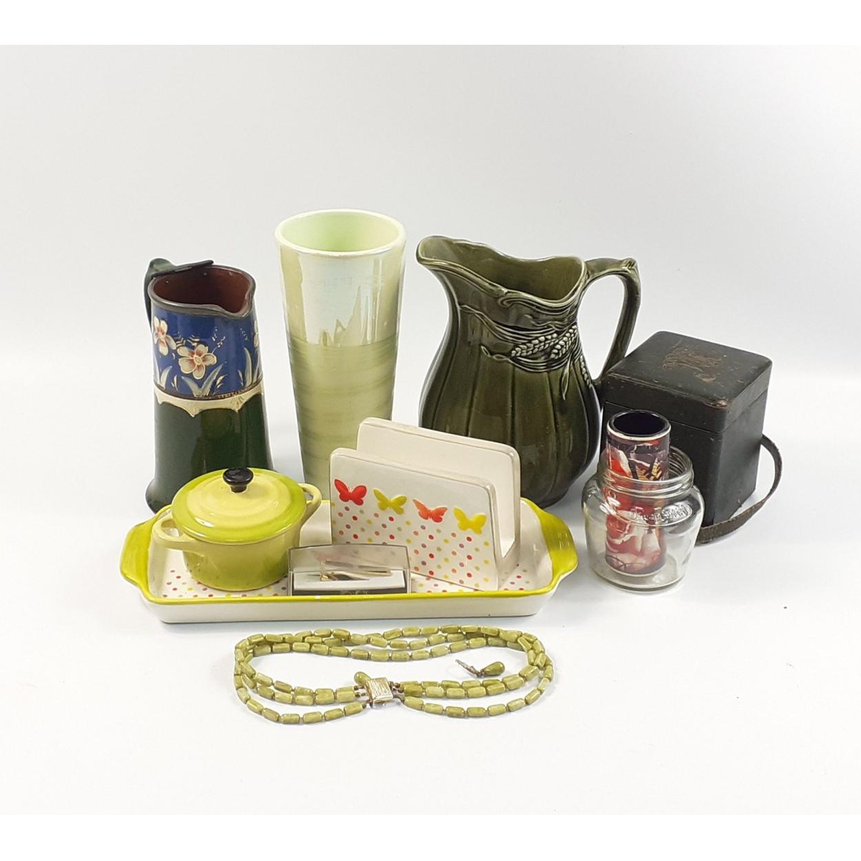 A mixed box to include 2 jugs, a vase, a desk tidy, a three-strand necklace of beads (44cm long) with matching earrings, plus a box of costume jewellery