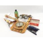 A mixed box to include 2 fountain pens with 14K nibs, a boxed set of CONWAY STEWART pen and pencil, plus various kitchen implements etc