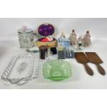 A mixed box to include a leather brandy glass holder (with glass), a green glass dish (14x14cm), a clear glass sandwich platter (23x15cm), a Q&Q ladies watch, a small oval wicker basket 16cm long plus various scarves etc, a pair of butter pats etc