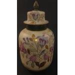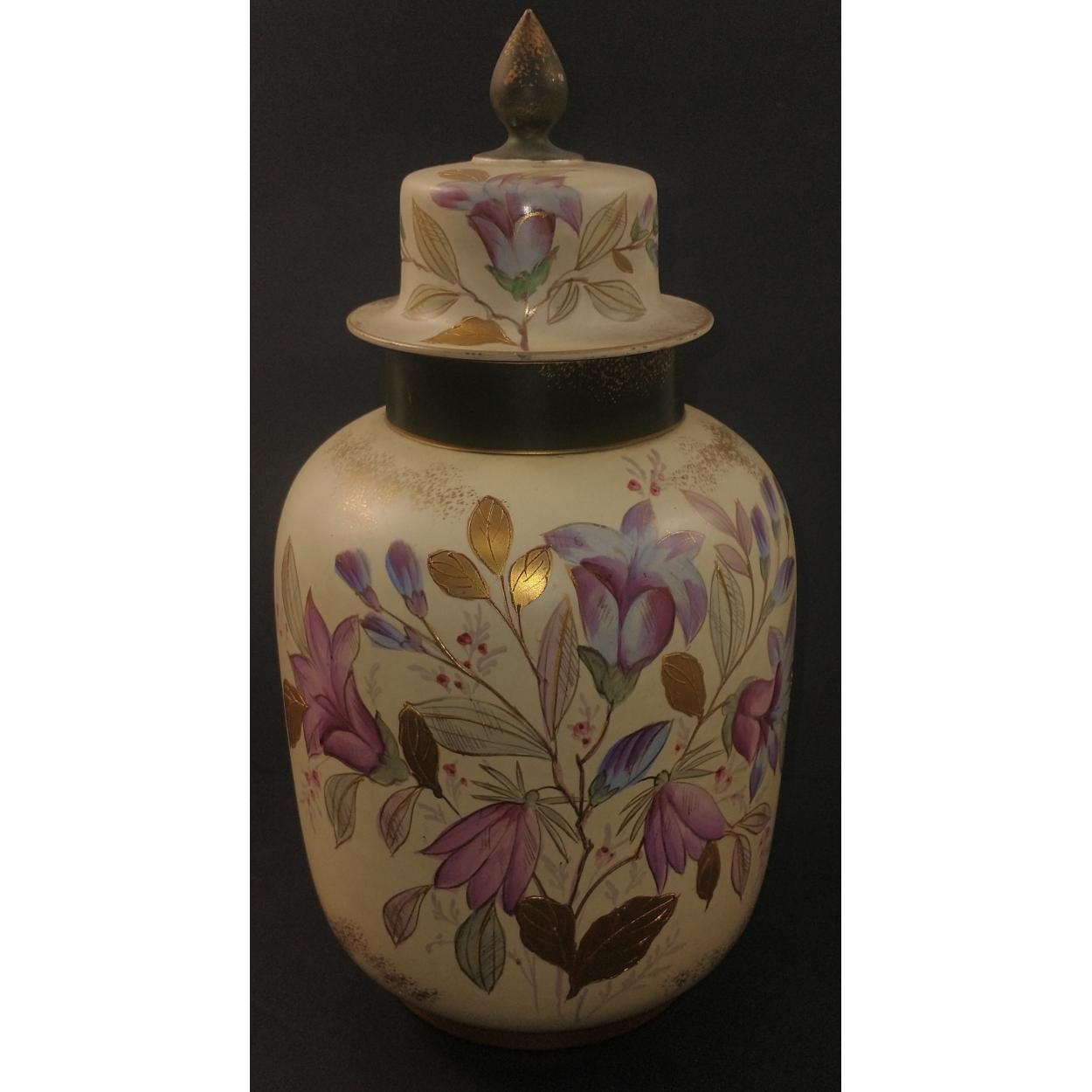 A HANDSOME DECORATIVE c1950's lidded handpainted floral patterned jar with a pointed 'finial' handle tip on the lid - dimensions 32cm tall x 16cm diameter approx - no chips, cracks or signs of damage repair