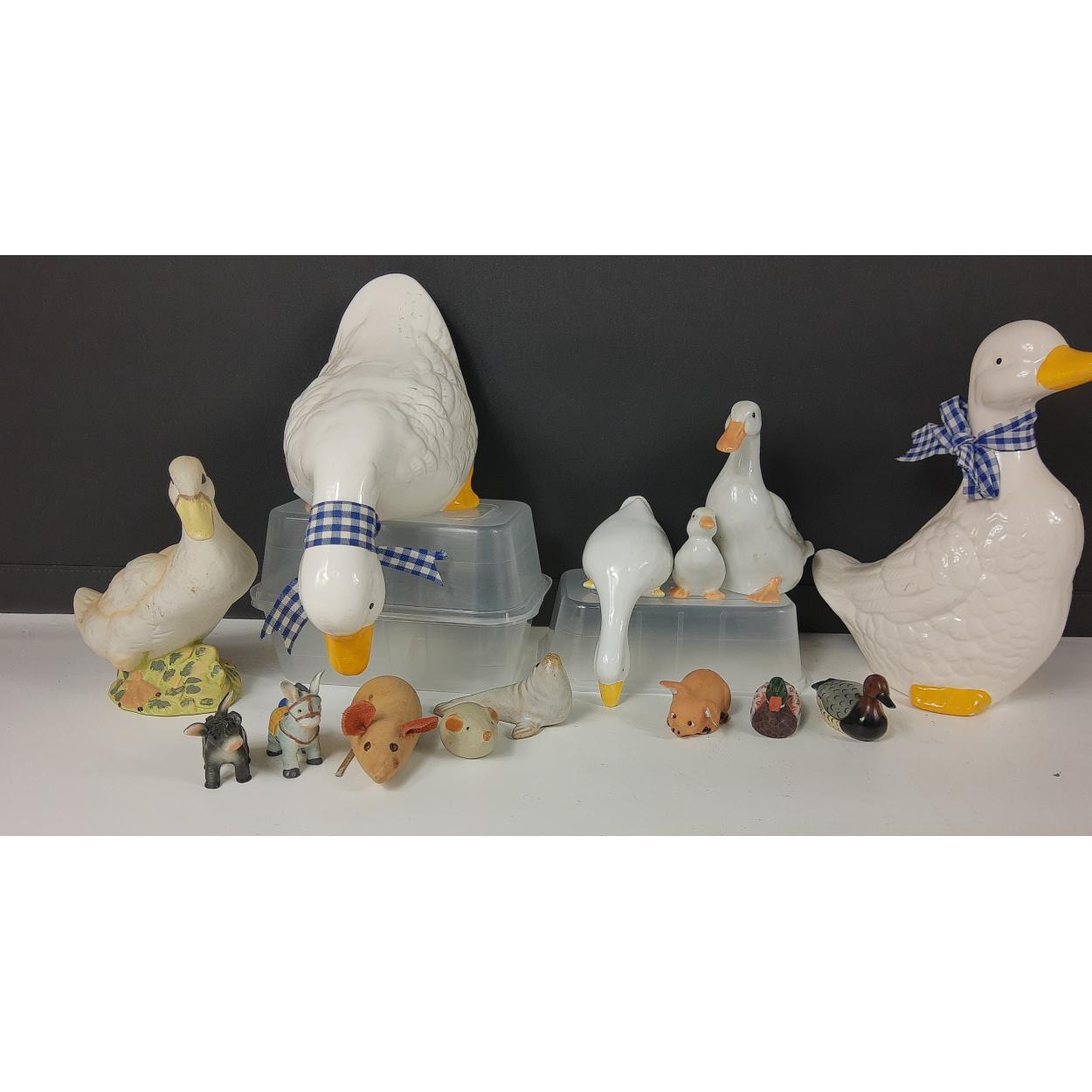 A charming collection of six ceramic ducks including two who like to spy over the edge of the shelf, tallest stands 24cm high plus a selection of whimsies including donkeys, mice and more ducks