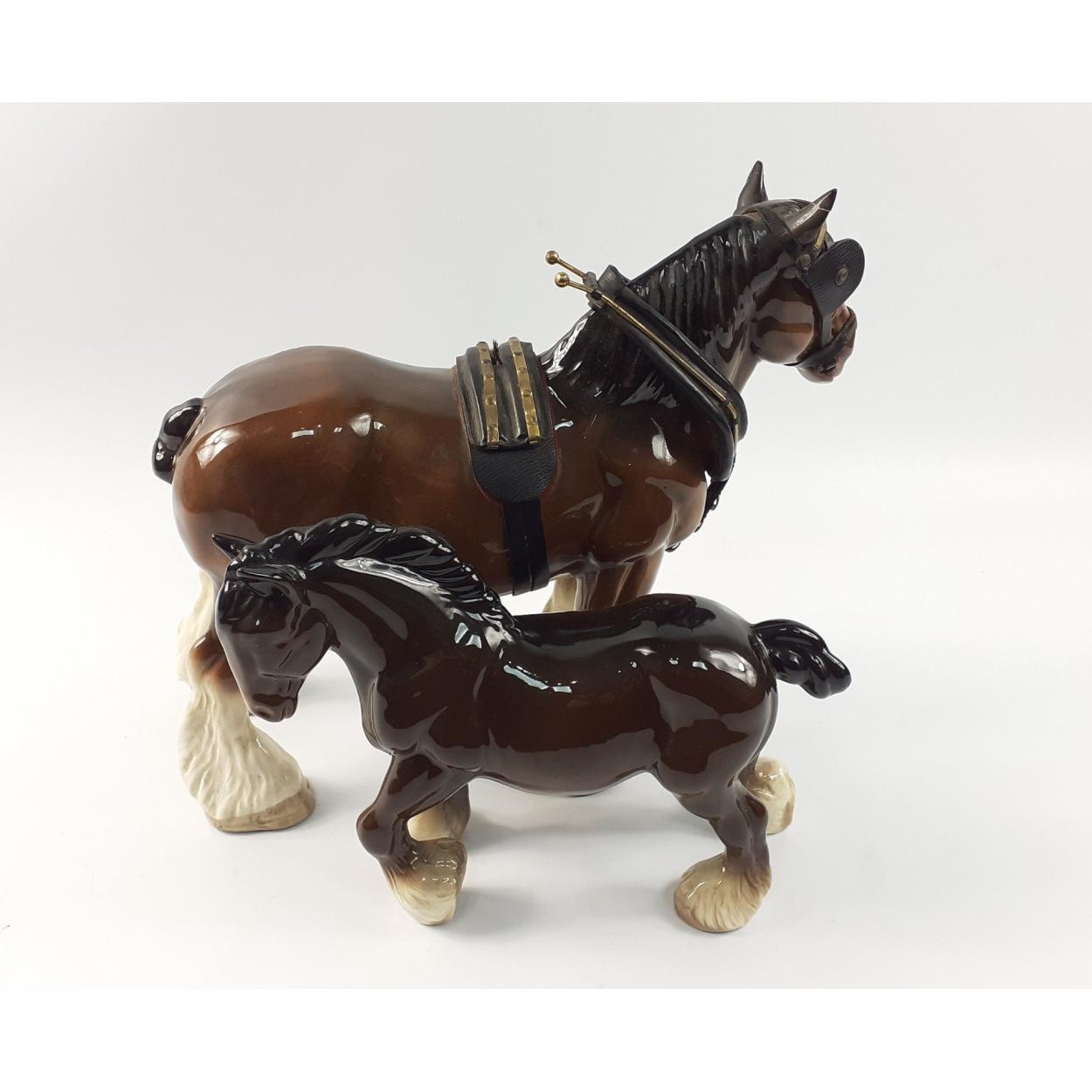 Two ceramic heavy horses one complete with leather bridle and saddle stands 28cm tall, the other is 18cm high