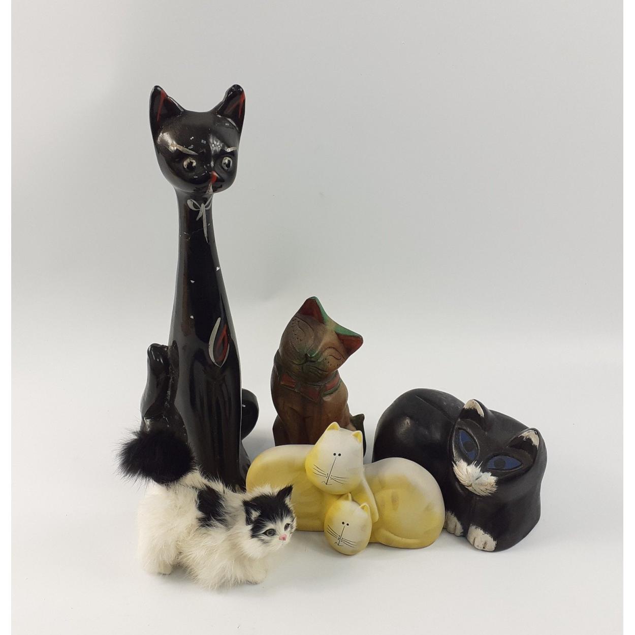 For the cat person in your life - five cats made from various media the tallest being 36cm tall, (neck previously cracked and repaired)