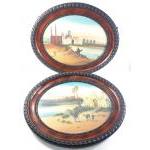 A pair of Middle Eastern paintings showing desert scenes with men and camels in attractive VICTORIAN mahogany oval frames approx 65 x 55cm