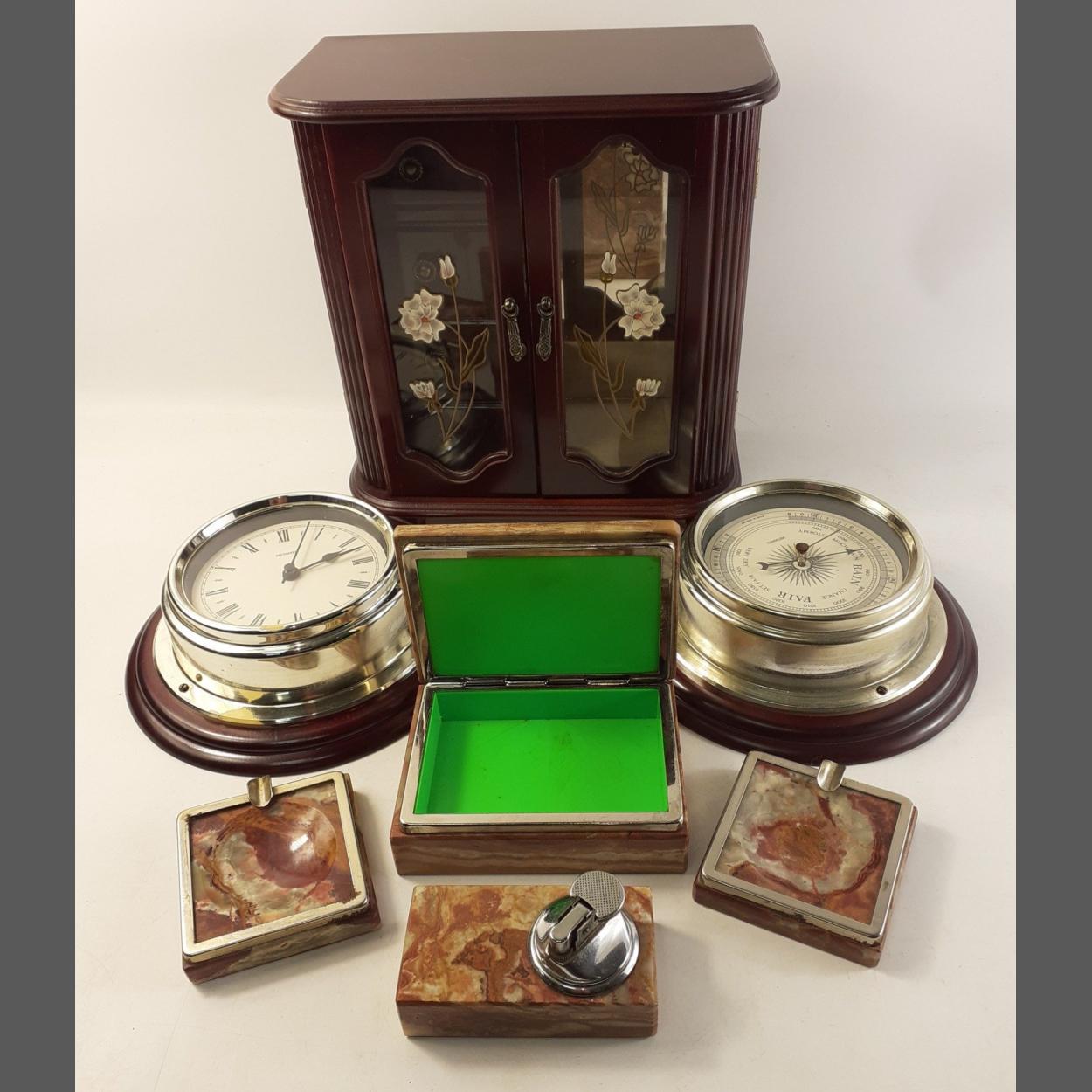 A mixed lot to include a mid-century coffee table smoking set comprising 2 ashtrays, 1 cigarette box and a table lighter, a METAMEC quartz wall clock and barometer and a double wardrobe style jewellery box with 4 drawers on one side and hangers for necklaces on the other.