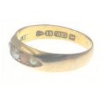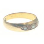 A 15Kt. 625 stamped gold band with 3 seed pearls and 2 pink stones, size O, gross weight 2.20g approx
