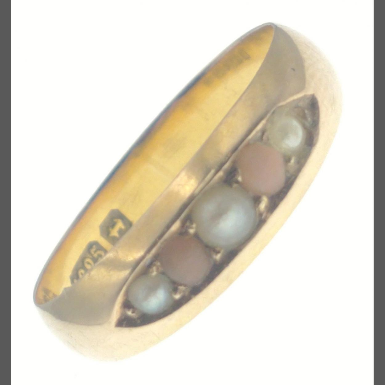 A 15Kt. 625 stamped gold band with 3 seed pearls and 2 pink stones, size O, gross weight 2.20g approx