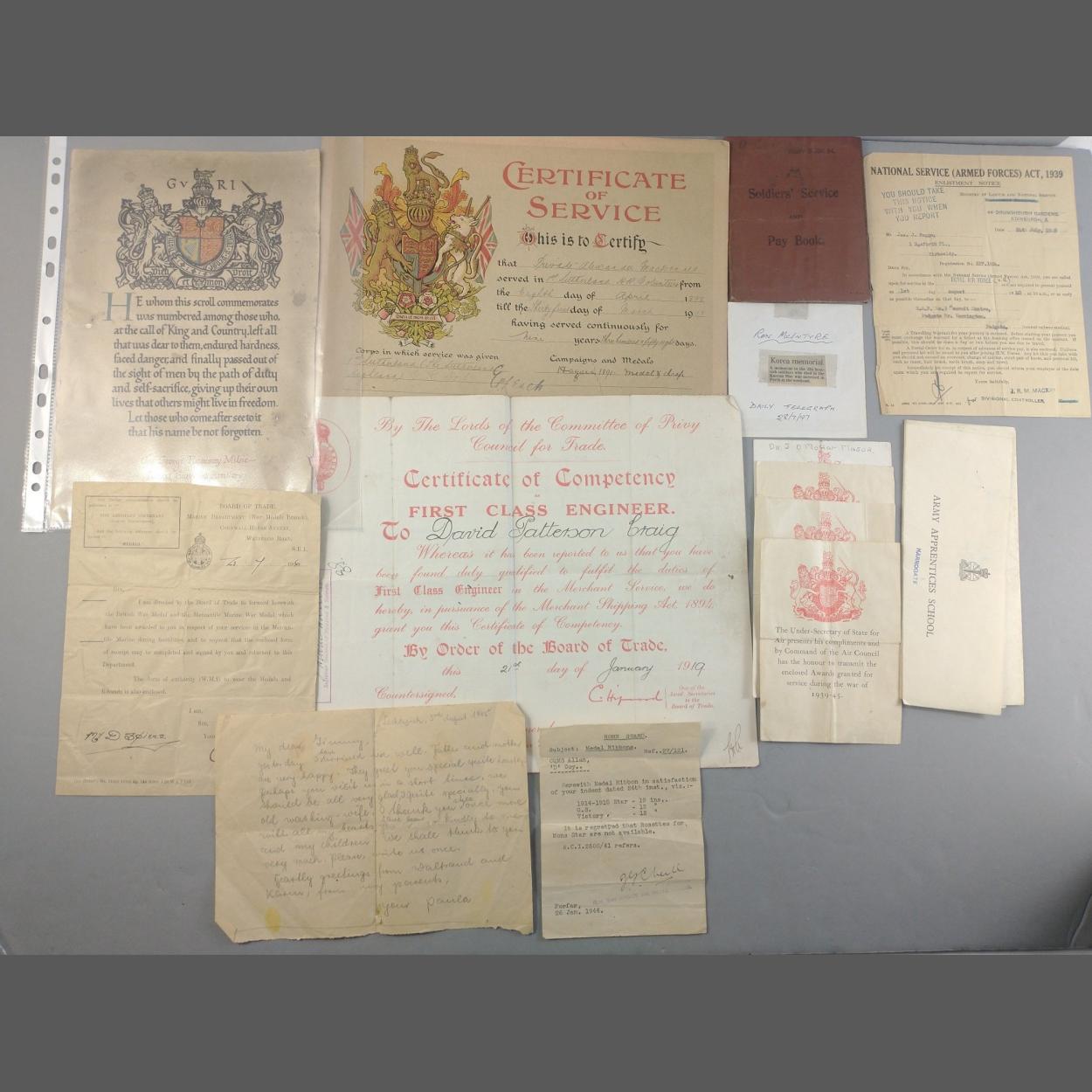 A small collection of military ephemera to include Enlistment Notice to Jas. Foggo, Certificate of Service, Soldiers' Service and Pay Book, Authority to wear War Medals for the Mercantile Marine Medal, Death Scroll and others