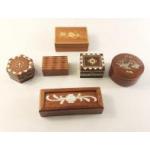 Six wooden trinket boxes each decorated with marquetry or mother of pearl. Lovely decorative objects. Largest 16 x 6cm approx