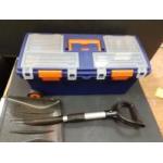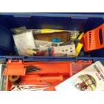 A large KETER plastic toolbox on wheels with various contents including nails, fixings, snow shovel etc