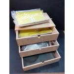 A cabinet maker's handmade small drawer set with 3 drawers to include contents sheets of sandpaper, round sanding discs and wet n' dry sandpaper - a complete array of sandpaper! - drawer set dimensions 36cm wide x 28cm depth x 28cm height approx