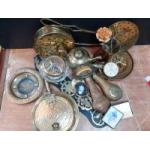 A large collection of BRASSWARE to include bed pan warmers, powder flasks, miniature picture frames, goblet, a handled sieve etc etc