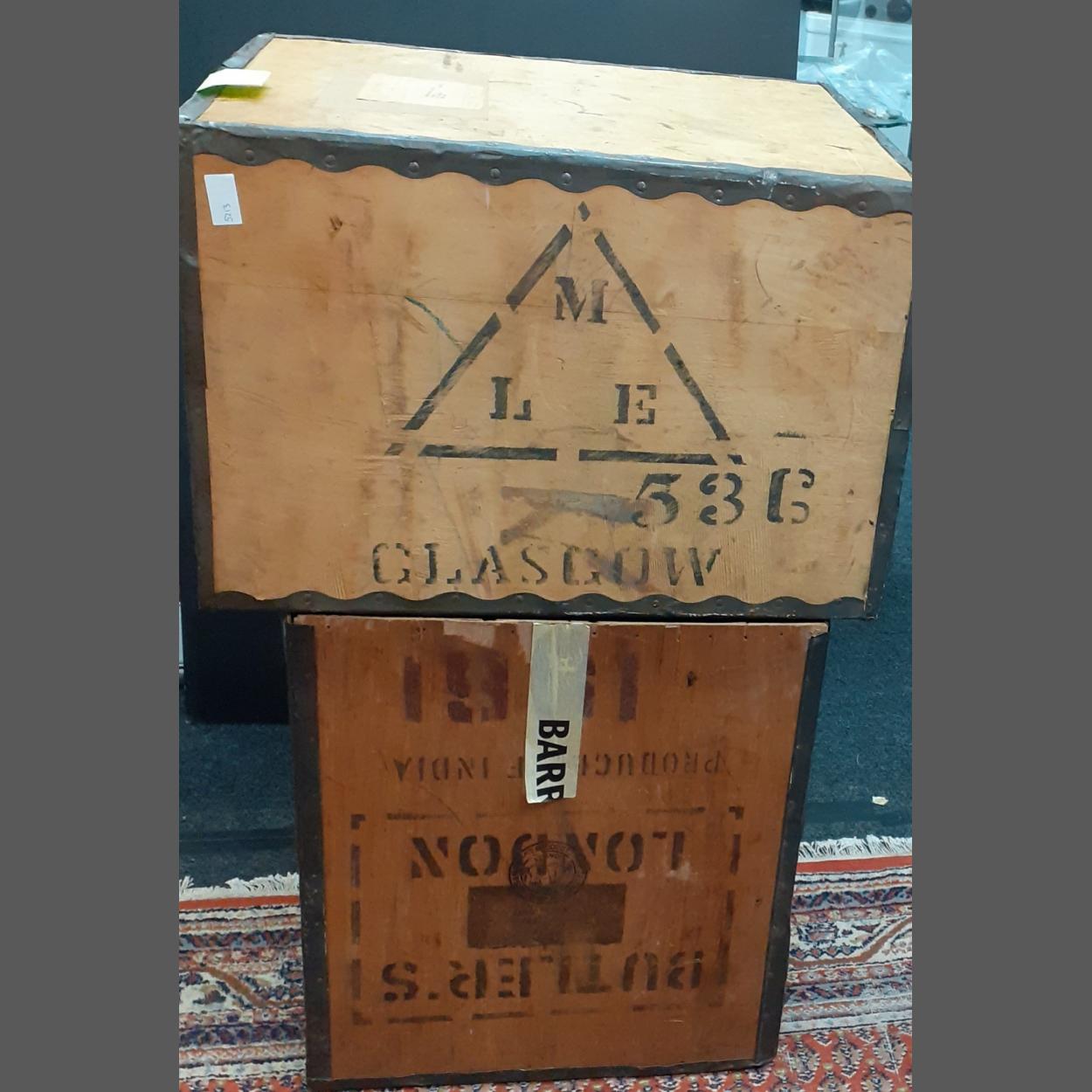 A pair of ANTIQUE wooden tea chests stating BUTLERS LONDON INDIAN TEA dimensions height 55cm x 50cm square top approx and MELROSES TEA AND COFFEE labelled MERCHANTS tea chest - dimensions height 60cm x width 53cm x depth 43cm approx