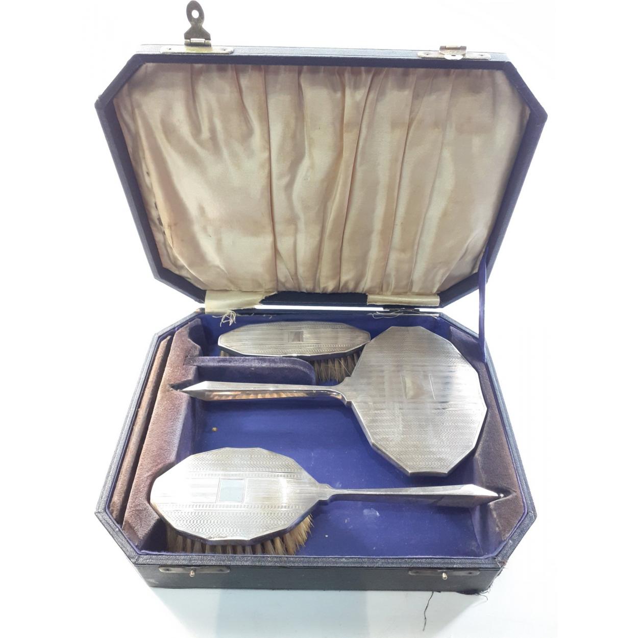 A boxed silver hallmarked dressing table set, Birmingham 1929, made by DAVIS, MOSS & Co, comprising hairbrush, hand mirror and clothes brush