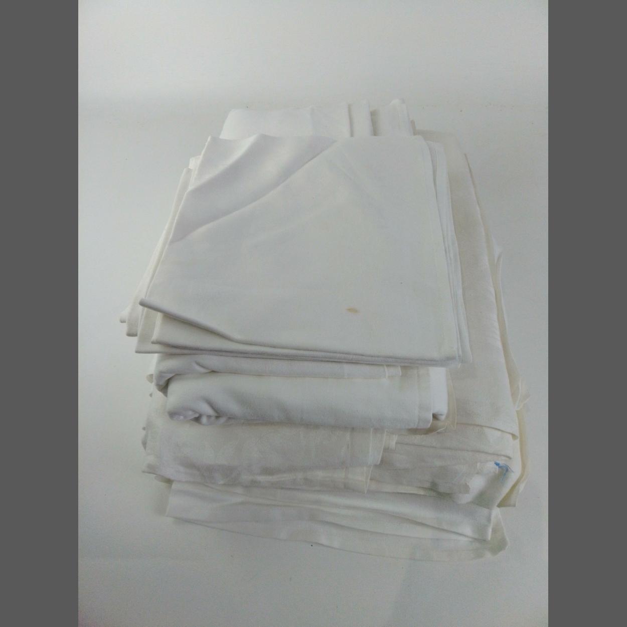 A collection of 7 embossed white linen tablecloths in various sizes and 4 napkins
