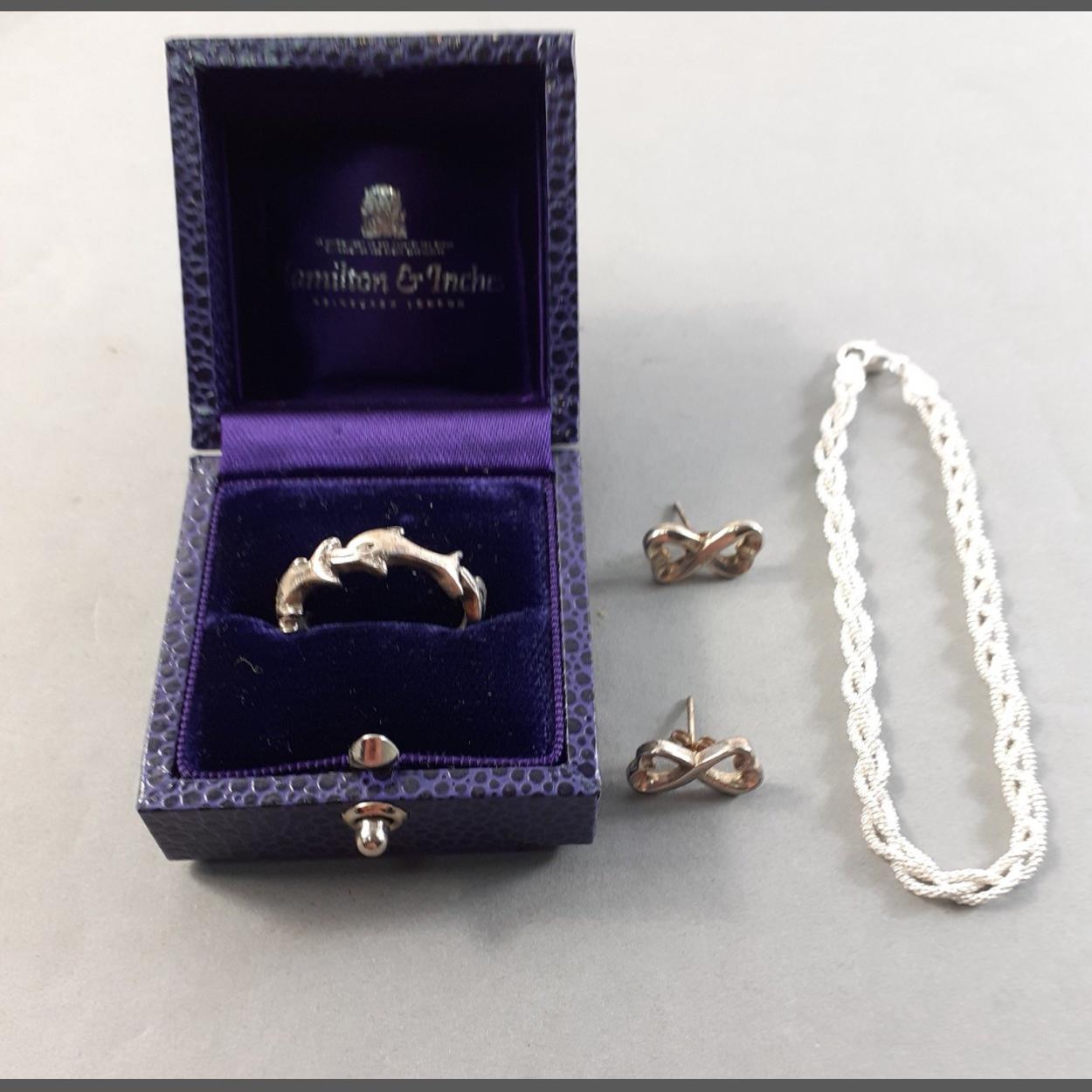 Silver jewellery lot consisting of a very pretty dolphin ring size H, a 925 stamped bracelet and a pair of ribbon earrings. Total gross weight 10.1g approx
